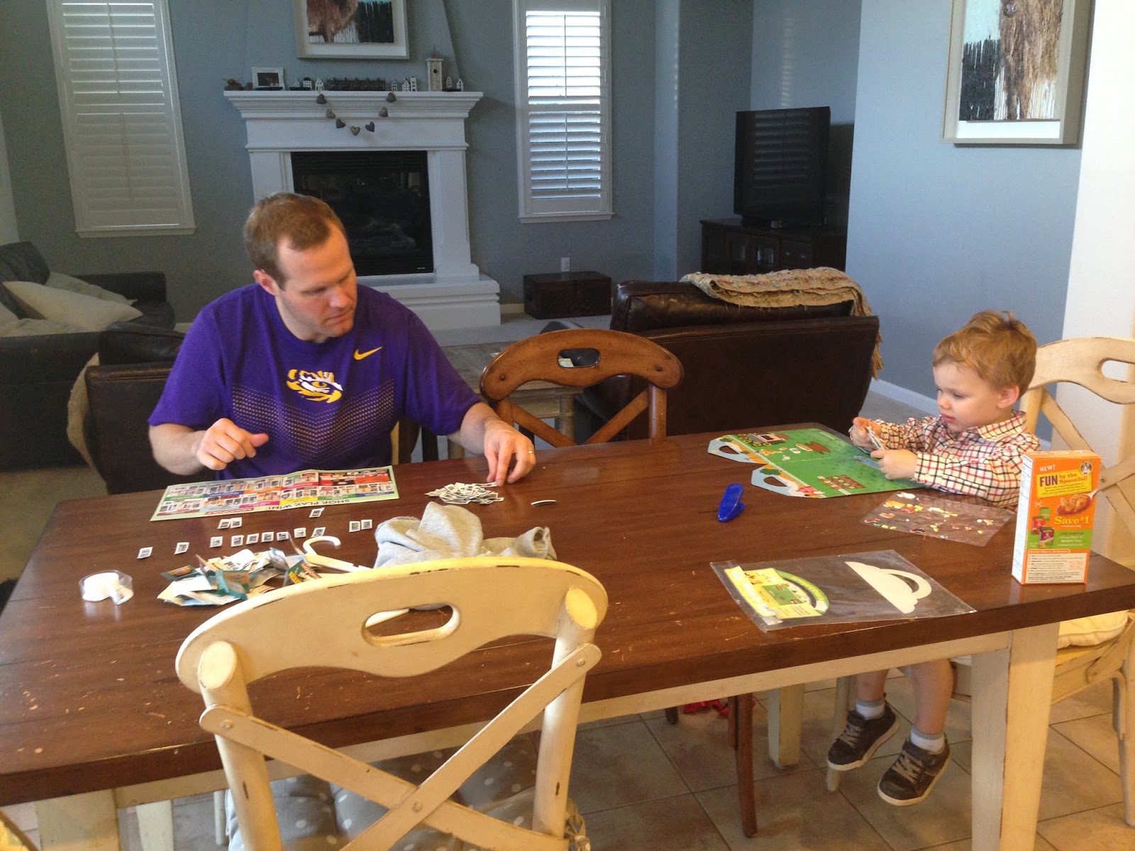 Safeway (our local grocery store) is doing a Monopoly game and Jonathan is super serious about it. Anytime I make a grocery run, that evening Jon sits down to systematically place the newest stickers on the board. Forest, of course, wants to be just like his daddy but Jonathan, of course, won't let the toddler anywhere near something as precious as a Safeway monopoly board, so instead we always set him up with his Melissa and Doug stickers. The resulting scene is pretty stinkin' adorable.